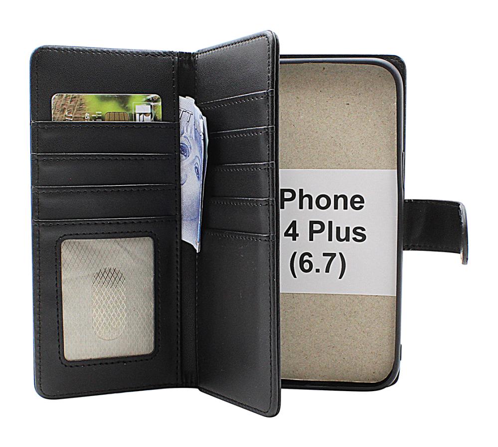 Tenk på Skimblocker XL som en bok. På den ene siden finner du fire kortlommer, hvorav én har gjennomsiktig vindu for ID eller førerkort. På motsatt side er det fem ekstra kortlommer. Bak begge kortsidene finnes det seddelrom. I den siste delen av "boken" sitter mobilskallet – der telefonen din festes trygt.