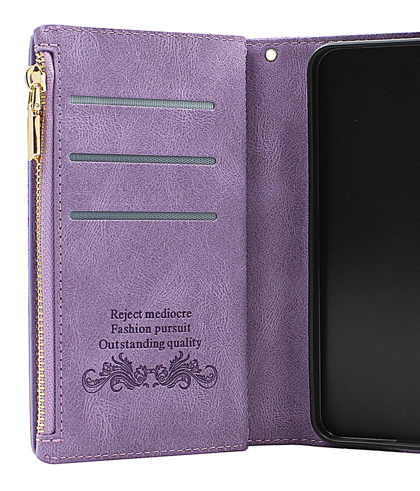 På midten av etuiet er det en ekstra flik med 3 kortlommer både foran og bak samt et mindre rom på midten til for eksempel mynter og lignende. Rommet lukkes med glidelås, men vær oppmerksom på at dette rommet ikke er så stort. Og jo mer du putter i lommeboken, jo tykkere blir den.